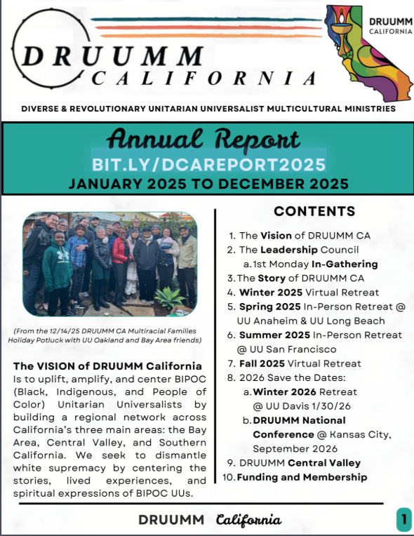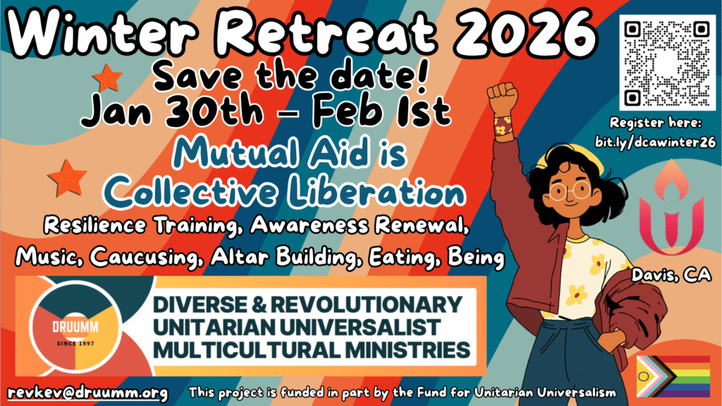 At the end of January 2026 DRUUMM California (Diverse & Revolutionary UU Multicultural Ministries) is inviting BIPOC (Black, Indigenous, and People of Color) Unitarian Universalists from across California to gather at Unitarian Universalist Church of Davis for a powerful weekend of connection and collective care. From January 30th to February 1st, 2026, we will come together for our winter quarterly in-person and hybrid on zoom retreat called “Mutual Aid through Collective Libreation.”
